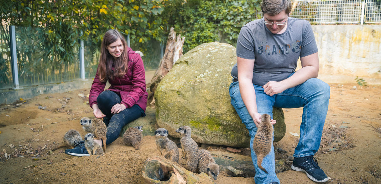 Bei diesem Paket starten wir mit einem Blick hinter die Kulissen des Erdmännchenhauses. Je nach Witterung werden wir anschließend die Anlage (innen oder außen) betreten und die neugierigen Erdmännchen selber entscheiden lassen, wie weit sie sich den Besuchern nähern möchten. Mit etwas Futter im Gepäck sollte das aber kein Problem sein. Ein Zoomitarbeiter erzählt viele interessante Informationen zu Erdmännchen allgemein bzw. natürlich auch zu unserer Gruppe: die Tiere und das Verhalten werden vorgestellt. Nach dem Kennenlernen befüllen wir noch ein Spielzeug zur Beschäftigung der Erdmännchen und beobachten, wie geschickt die Tiere das "Problem" lösen. Fragen werden selbstverständlich gerne beantwortet.