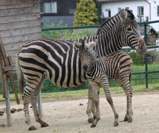 Bereits Ende letzten Jahres konnten geübte Besucher den immer runder werdenden Bauch von der Zebrastute „Andara“ erkennen. In der Nacht auf den 26. April 2017 war es nun endlich so weit! Das Kleine ist gesund und munter und erwartete die Tierpfleger am Morgen bereits außerhalb des Stalles. Nach einer Tragzeit von 12 Monaten wirft eine Zebrastute ein etwa 30kg schweres Fohlen. Bereits nach 11 Minuten kann ein Zebrajunges stehen und versucht gleich an die Muttermilch zu kommen.