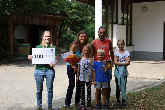 Am frühen Vormittag empfing die zoologische Leitung Elisabeth Hölzl, MSc. Familie Mülleder aus Zwettl/Rodl mit einem großen Blumenstrauß und einen Gutschein für eine Jahreskarte. Frau Mülleder betrat als 100.000ste Besucherin in diesem Jahr den Zoo Linz.