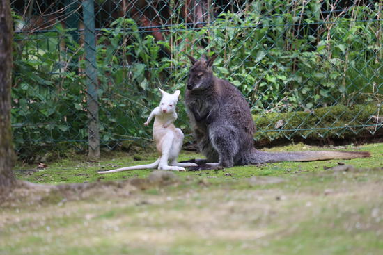 Mit etwa drei Monaten konnten eindeutige Bewegungen im Beutel festgestellt werden und das junge Känguru wagte die ersten Blicke durch die Beutelöffnung. Die Freude war groß, als ein fast schneeweißes Gesicht mit typisch roten Augen die Blicke der Pfleger auf sich zog.